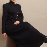 L’ensemble SOFIA est composé d’une veste structurée à épaules marquées et col châle revisité, fermeture croisée à boutons contrastés uniques.