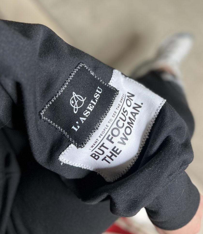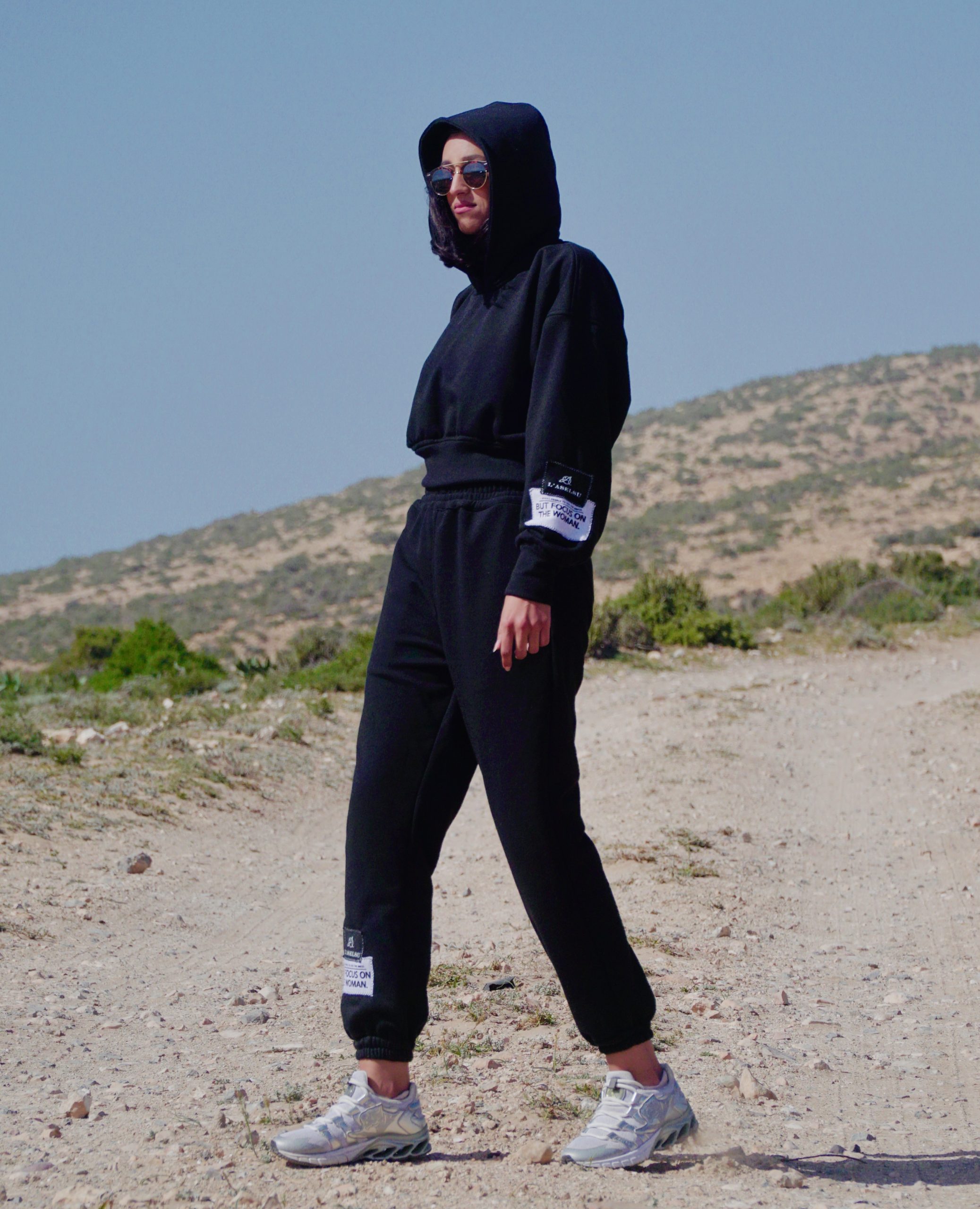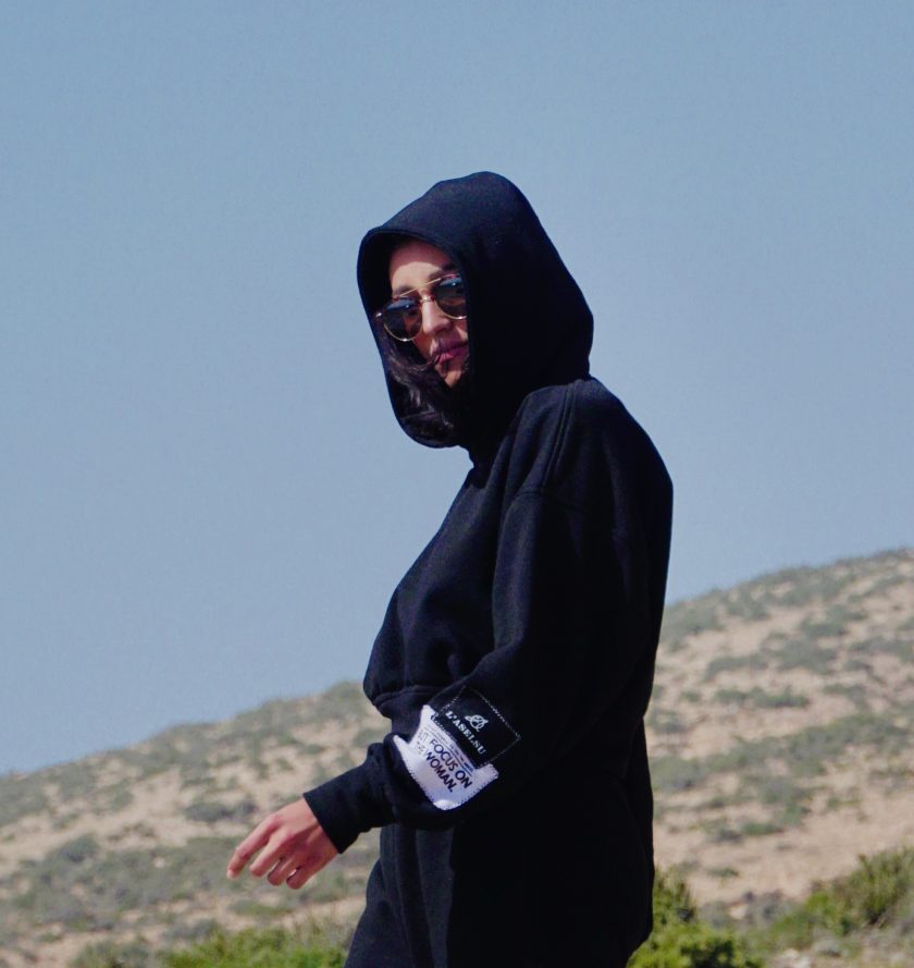 Cropped sweat -shirt oversize. Manche longues. Etiquette quote : « I want people to see the dress but focus on the woman ». Comprend une capuche et col à revers.