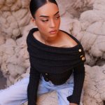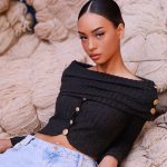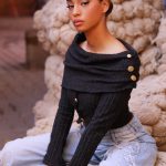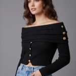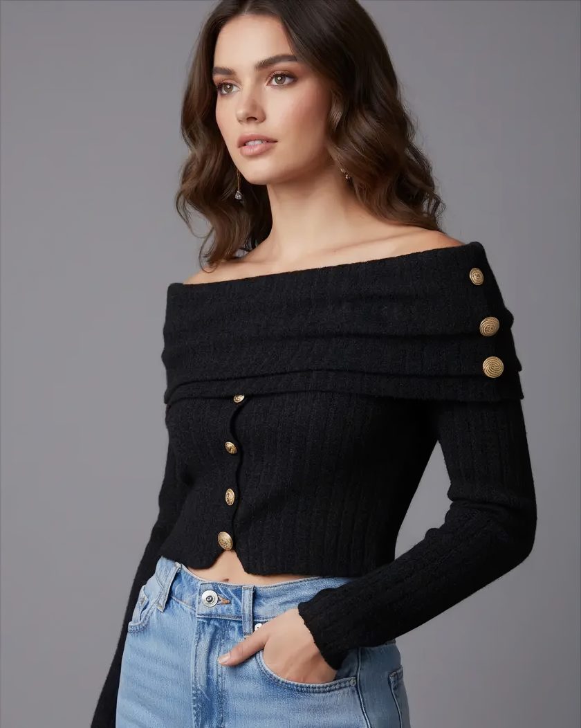 Top à encolure bardot drapée à envers avec des plis, boutons dorés sur l’épaule et le devant. Coupe ajustée et manches longues.