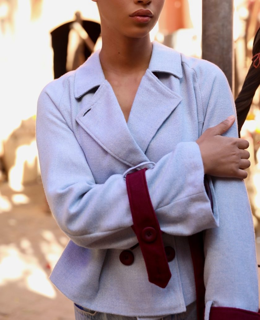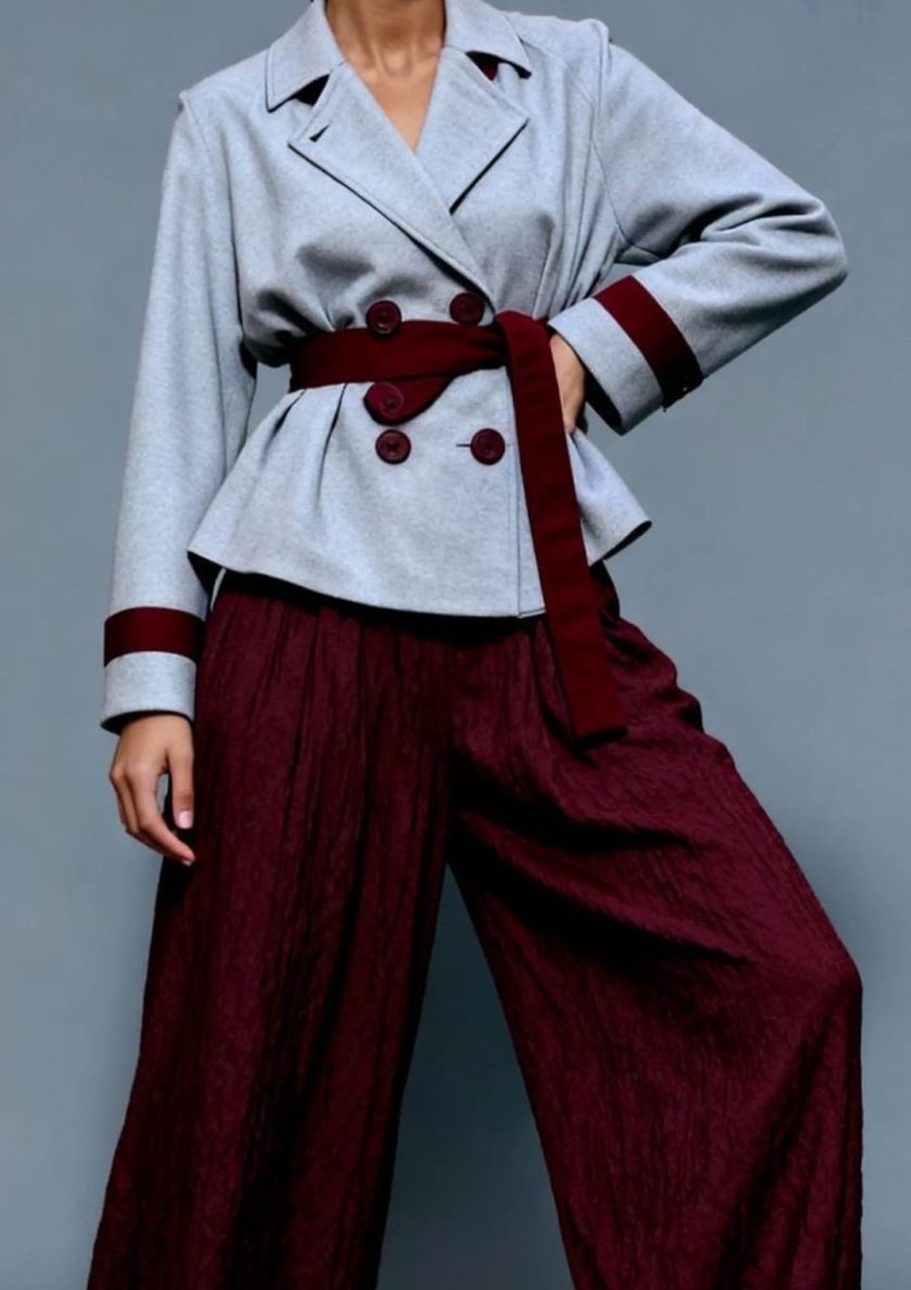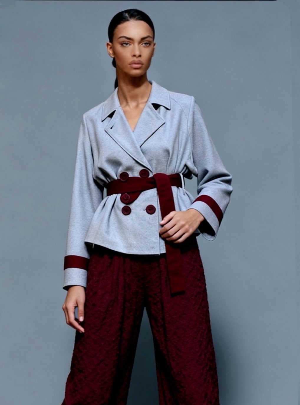 Trench court bicolore en cachemire, coupe structurée avec ceinture ajustable contrastée et col à revers. Boutons burgundy assortis. Doublure en satin burgundy. Manches longues ajustables avec passants et bouton.