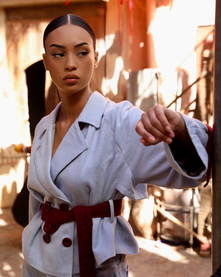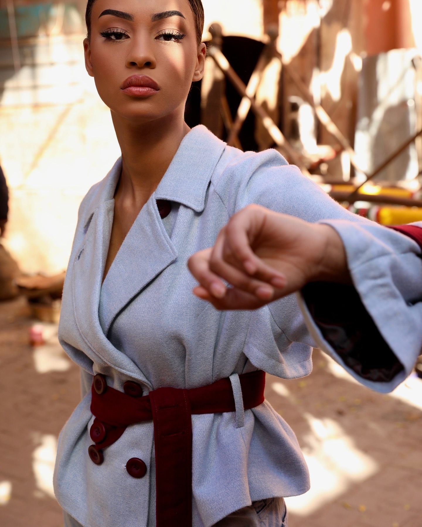 • Détails : boutons contrastés, ceinture en tissu.